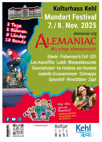 Notieren Sie sich 7. und 8. Nov. 2025 und kommen Sie mit Familie, Freunden und Nachbarn ans Alemaniac Mundartfestival in Kehl.
