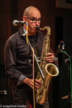 Er spielt bei SPRUCHRIF Saxophon, Querflöte oder Gitarre.