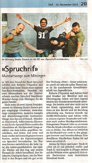 Adrian und Robi waren bei Dominik Jäggi der uns im Radio Inside in Zofingen interviewte zu Besuch und stellten unsere CD PETER «keine weiss wieso» vor. Wir empfehlen euch das spannende Programm von www.radioinside.ch, das über Internet, DAB+, Swisscom TV und mobile zu empfangen ist. Ausstrahlungstermine unseres Beitrags waren: Mo 24. bis Sa 29.12.2012, So 30.12.2012